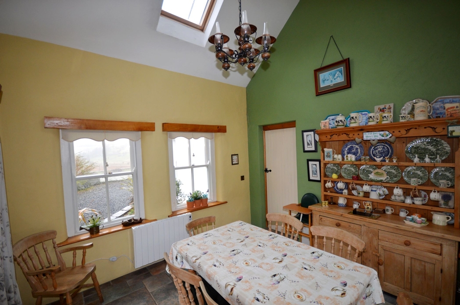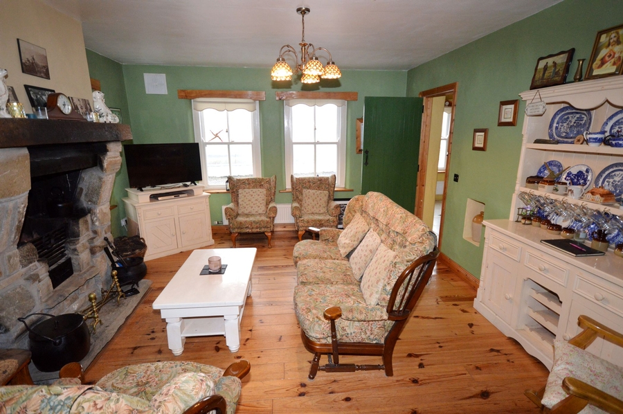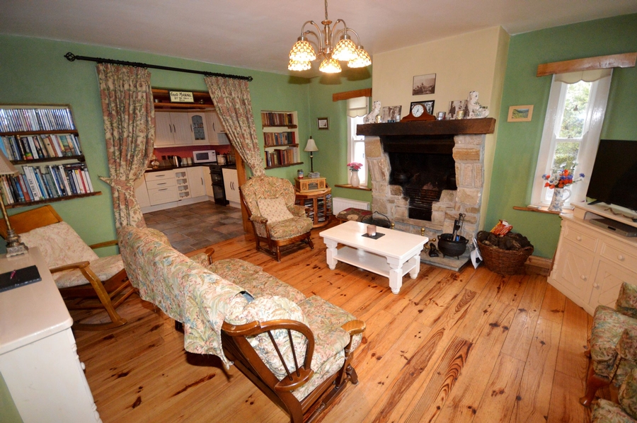 | Sitting Room | 4.80m x 4.00m | Old style open fireplace with sandstone chimney breast. Four windows (dual aspect). Timber pine board floor. Built-in dresser unit. Two built-in book shelf units. Five stem ceiling light. Open arch into kitchen. |