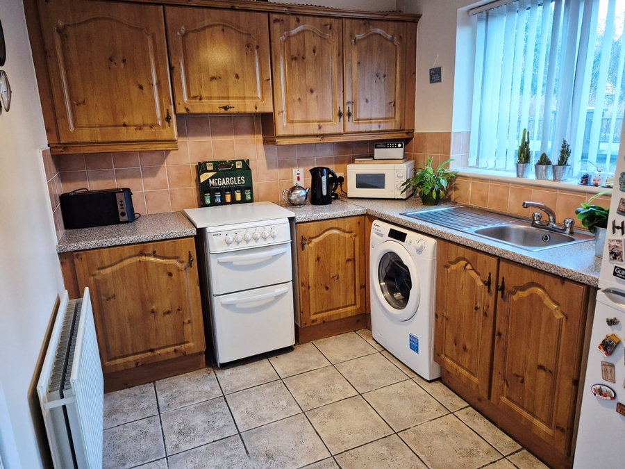 | Kitchen | 2.7m x 2.35m | High and low level (wood effect vinyl) Tiled between units and worktop. Stainless steel sink. Electric cooker. Fridge freezer. Washing machine. Window to front with vertical blind. Centre ceiling light. Floor tiled. Radiator. |