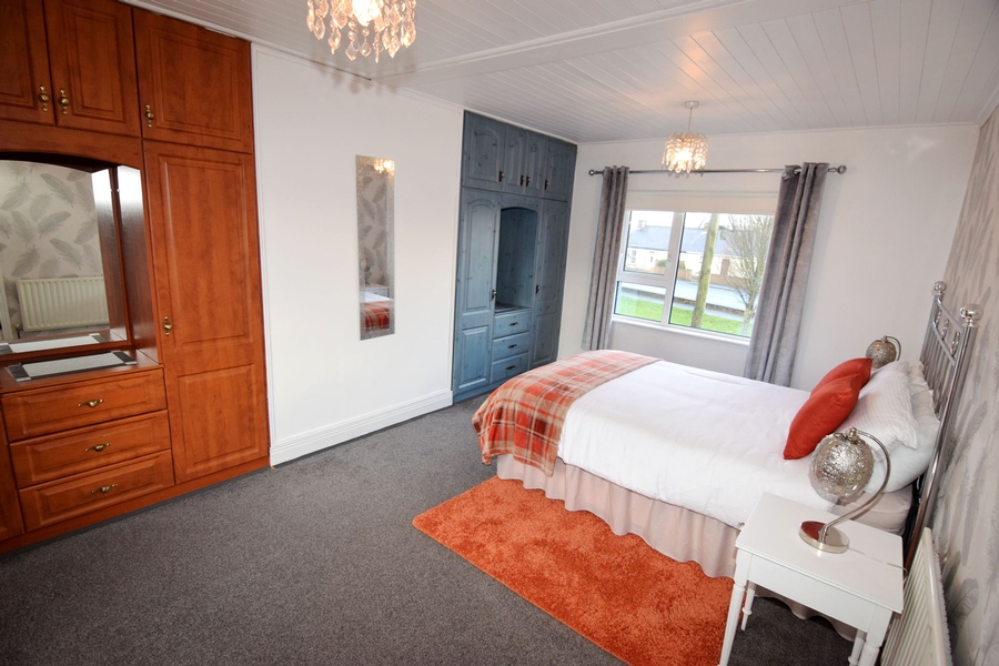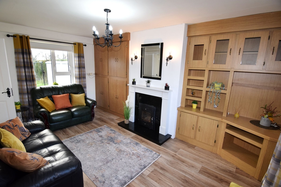 | Sitting Room | 4.95m x 3.05m | Dual aspect windows (north & south). Vinyl floor. Insert stove with back boiler & ceramic surround. Two walls lights above. Ceiling height wall to wall oak display unit. Ceiling height wall to wall hot press. 1 radiator. Five stem centre ceiling light. |
