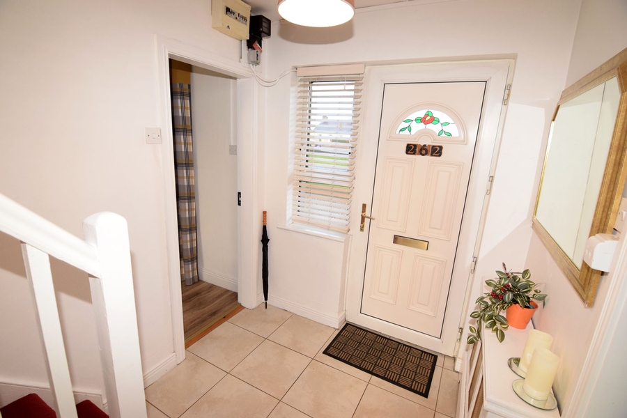| Hallway | 2.30m x 2.00m | PVC front door with window to the side. Tiled floor. Carpeted staircase leading to first floor. White wooden radiator cover with gold can grille insert. Centre ceiling light. |