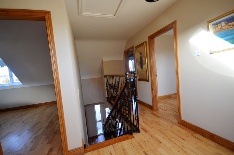| Hallway | 5.40m x 2.55m | PVC door with two glass panels each side. Decorative Wrought iron staircase to first floor. Two centre ceiling lights. Tiled floor. Hot press accessed off hallway. |