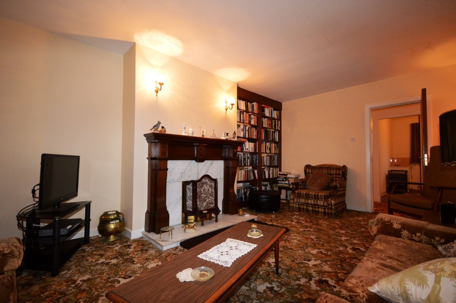 | Sitting Room | 5.6m x 3.8m | Open fire with mahogany fireplace and marble insert. Dual aspect windows - one south-facing and one west-facing. Built-in floor to ceiling bookcase. Floor carpeted. Two wall lights. |