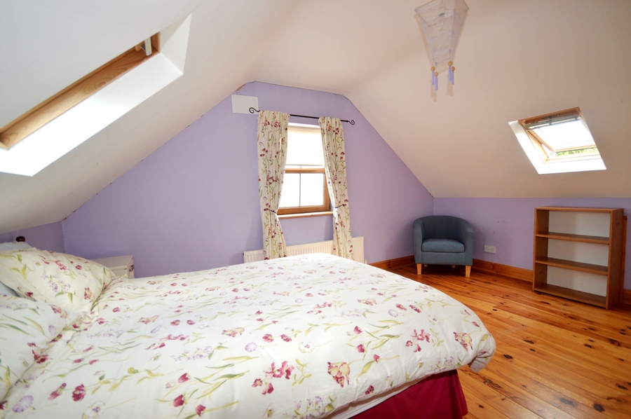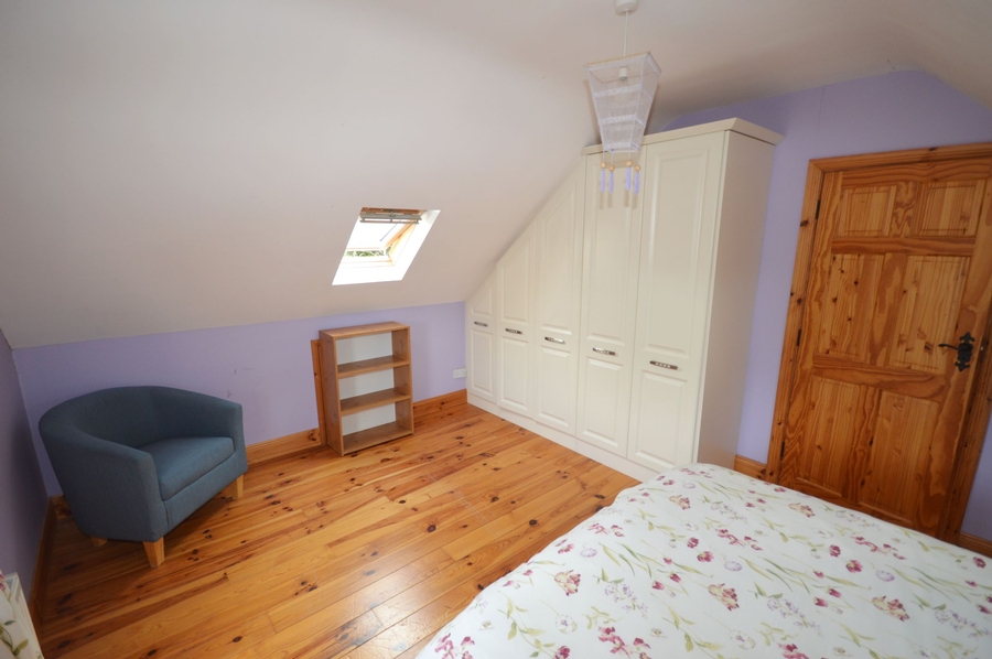 Bedroom Two   4.60m x 3.50m   Gable window. Two Velux windows. Built-in wardrobe. Pine floor.