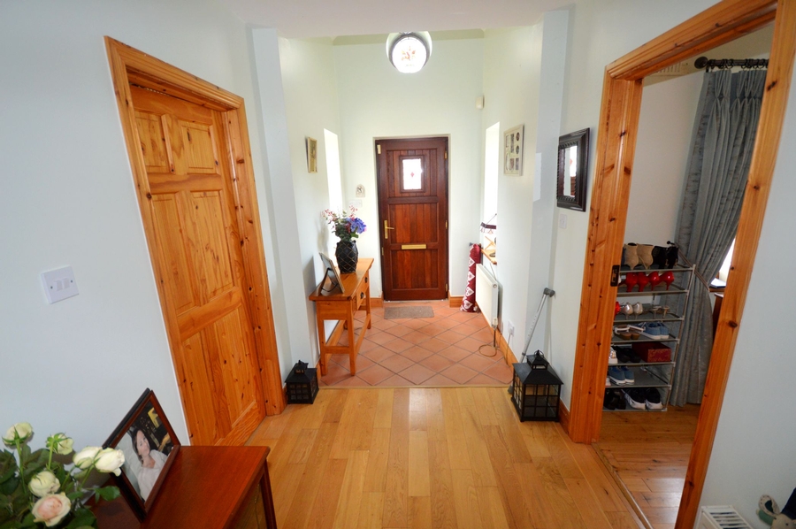 Hallway   6.80m x 2.00m   Entrance area tiled floor. Main portion oak floor. Mahogany front door. Two side windows. Return stairs to first floor.