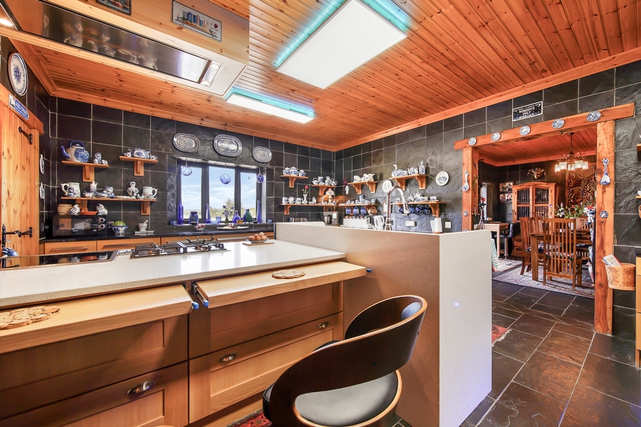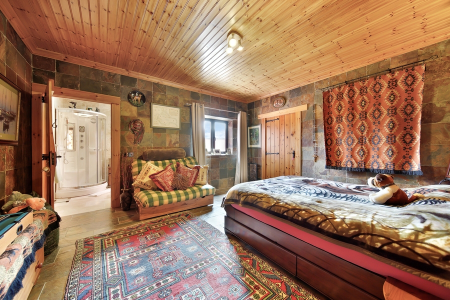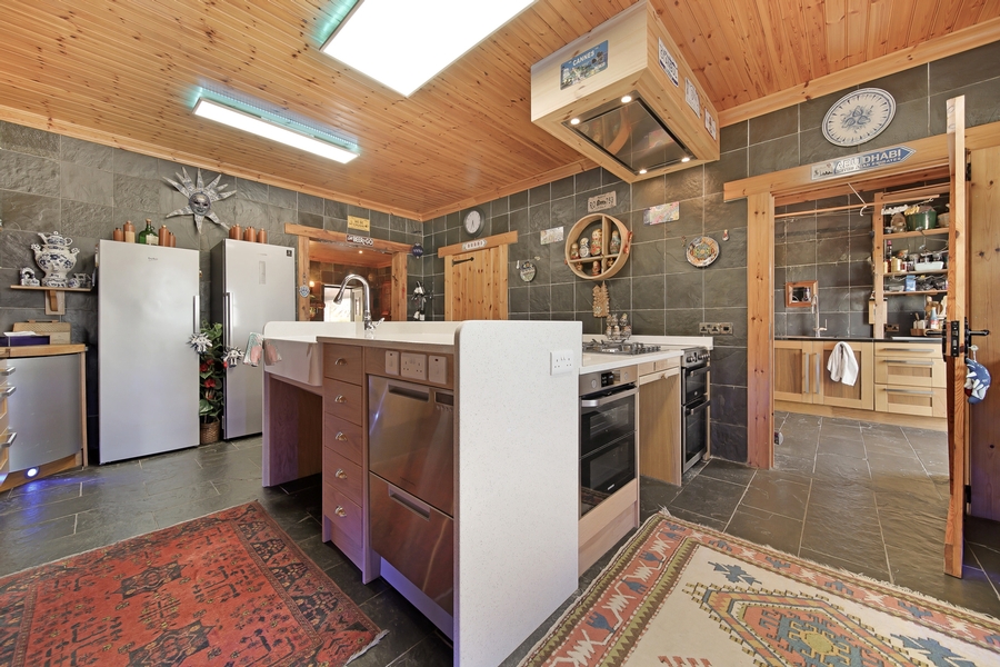 Kitchen | 6.0m x 4.3m | Low-level oak-finished kitchen units, Polished granite kitchen worktop Central island unit with breakfast counter and working area with speckled white quartz worktop. Range of floating shelves. Double Belfast sink‚ electric cooker‚ gas hob & 2 drawer dishwasher - all in centre island unit. Floor & walls tiled with natural black slate. Walk-in Wardrobe 3.0m x 1.8m Open-shelved. Tongue & Groove timber ceiling with LED panel lights. |
