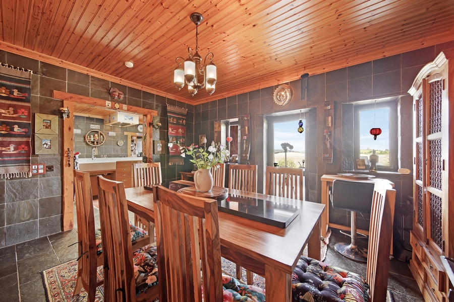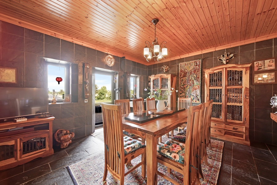 Dining Room | 4.7m x 4.1m | Open arch from kitchen. Glazed door to covered outside seating area. 2 windows. Floor tiled with natural black slate. Walls part brick‚ part natural black slate. Tongue & groove timber ceiling. 5 stem centre ceiling light. 2 matching wall lights. |