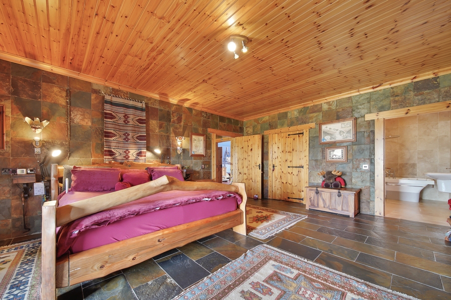 Bedroom 2 | 4.8m x 4.2m | Gable window. Floor & walls finished with Chinese slate. Tongue & groove timber ceiling. Large Walk-in Wardrobe 2.4m x 1.8m Shelved on three sides. Large Walk-in Wardrobe 2.4m x 1.8m Shelved on three sides. |