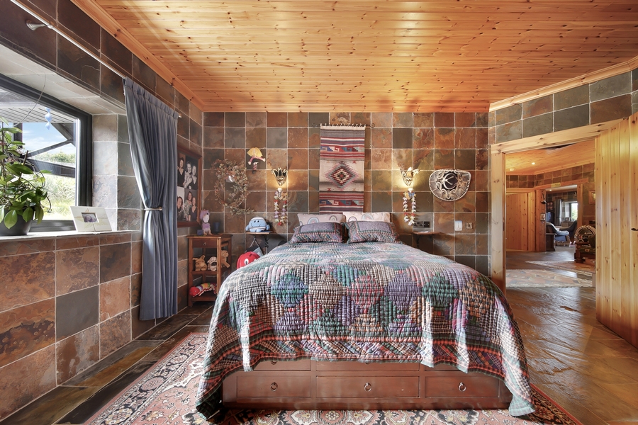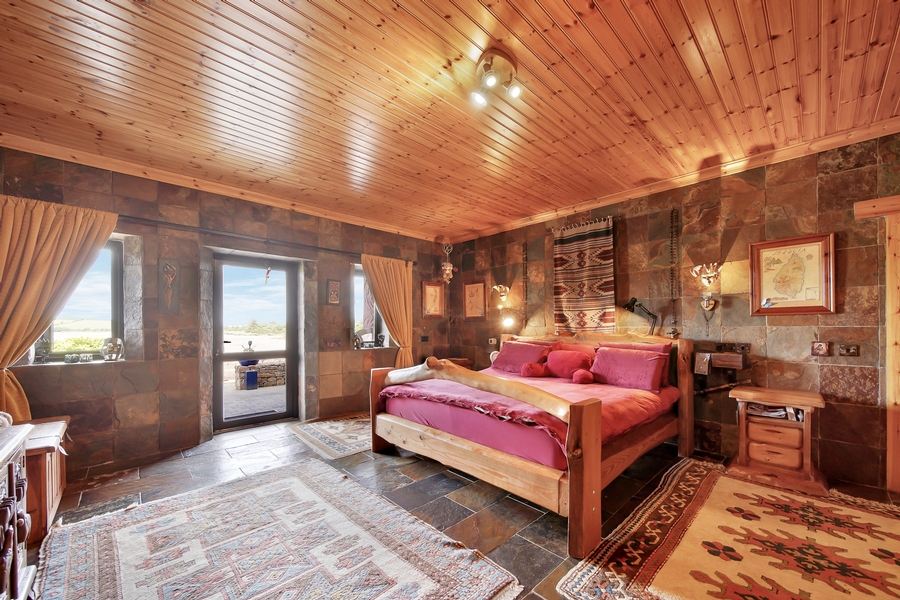 Bedroom 1 | 6.0m x 4.8m | Glazed door & two windows with sea views. Floor & walls tiled with Chinese slate. Tongue & groove timber ceiling. Centre ceiling light. Two bedside wall lights. Large Walk-in Wardrobe: 3.0m x 2.2m Tiled floor & walls. Fully shelved. |