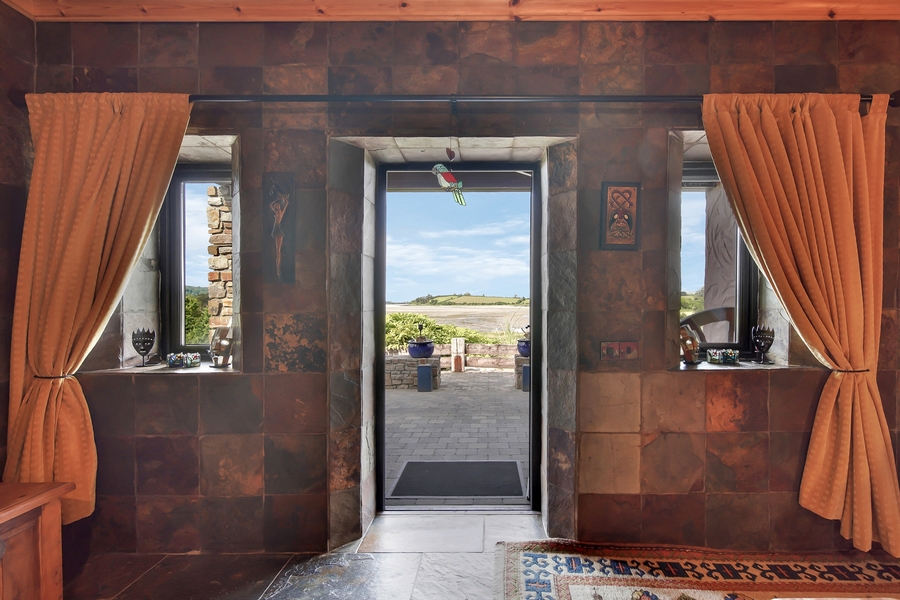Outside Reception Area | 4.4m x 3.6m | Stone tiled floor. Natural stone wall surrounding front door. Slated roof with Velux window. |