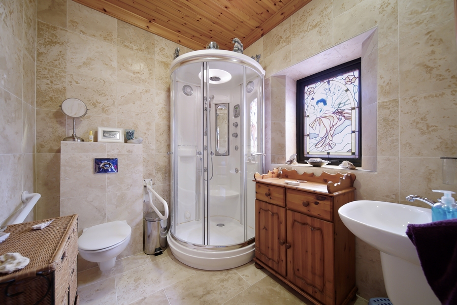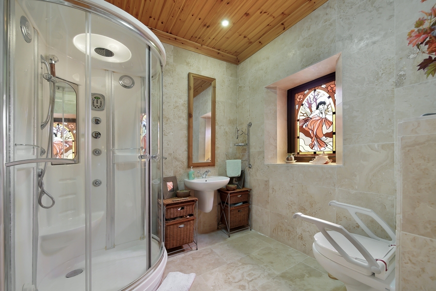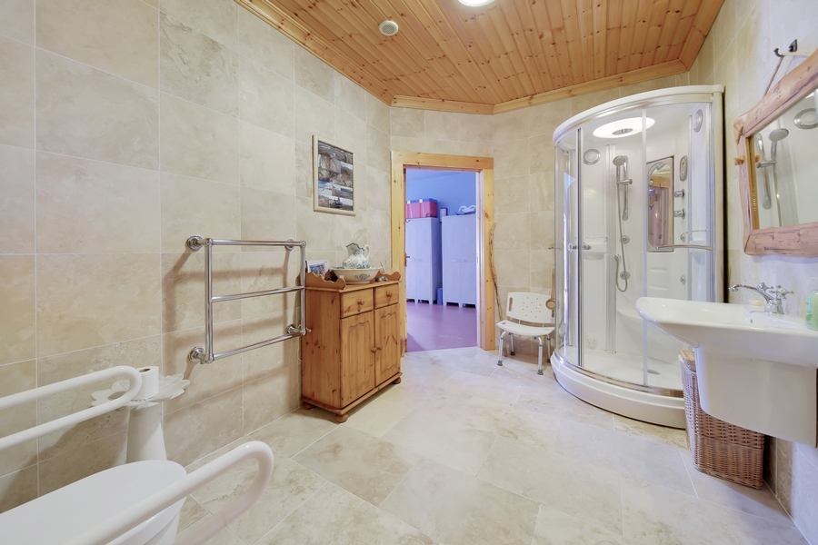 Shower Room | 3.8m x 2.6m | Access from both hallway and from Therapy Room. WHB‚ WC & multi-jet shower. Porcelain tile floor & walls. Tongue & groove timber ceiling. Chrome heated towel rail. |