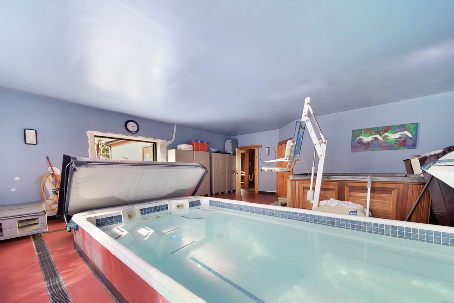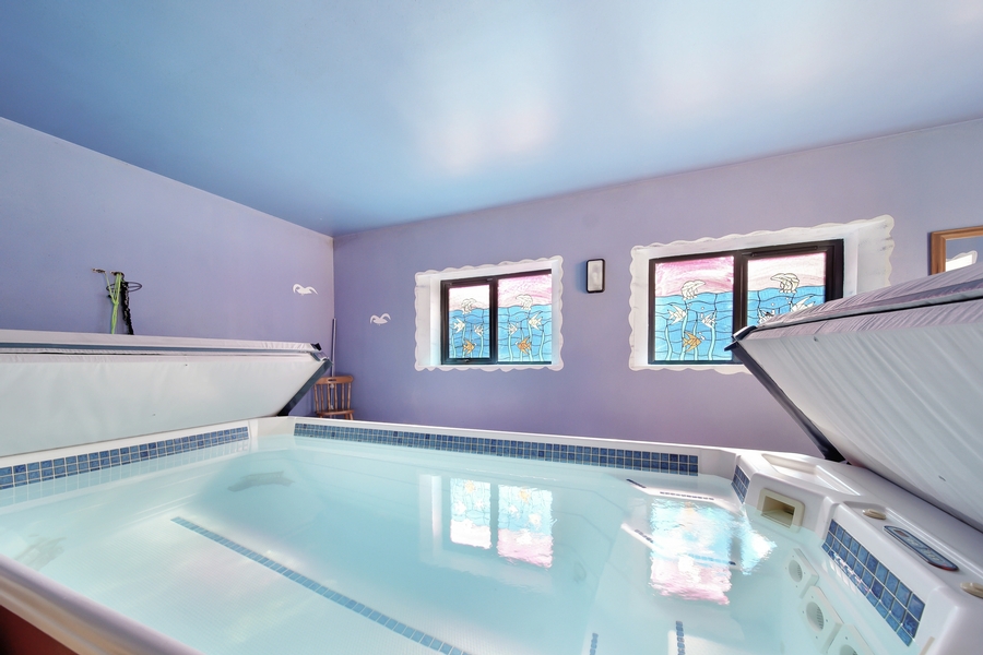 Therapy | 6.8m x 6.8m | Therapy exercise swimming pool with power jets. (Swimming pool - 6.0m x 2.2m). Hot tub. Low maintenance floor. Double doors with coloured glass to paved outdoor seating area. Two windows with coloured glass. |