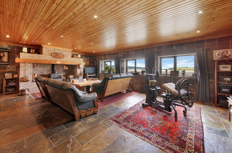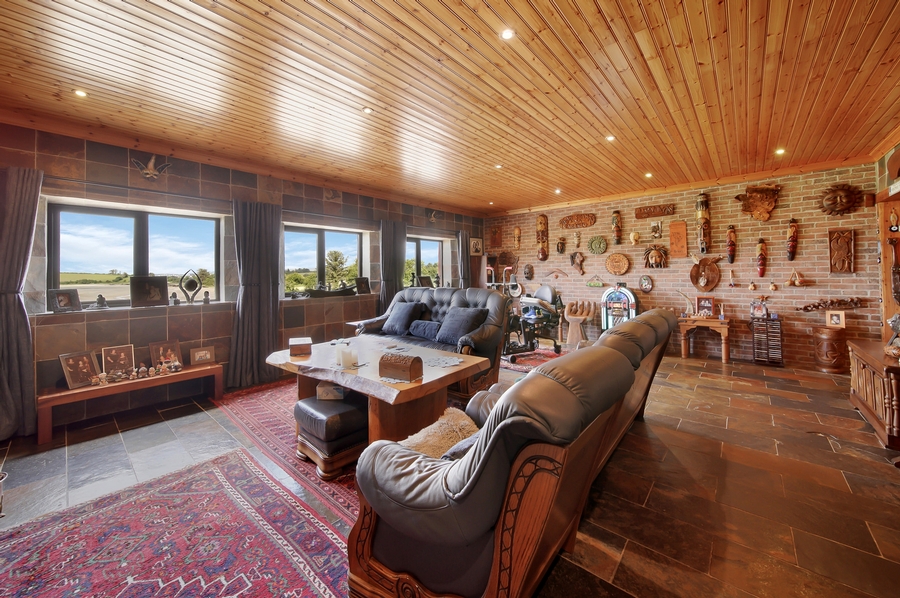 Reception Hall | 7.0m x 4.8m | Slate tiled floor. All walls finished with slate tiling. Tongue & groove timber ceiling. Recessed ceiling lights. Large walk-in hot press. 6 x wall lights. |