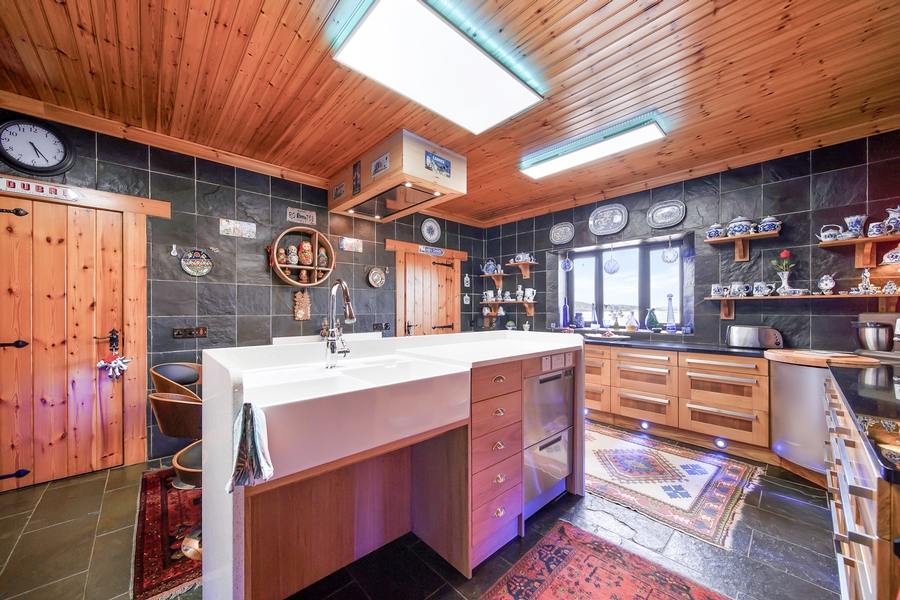Utility | 3.0m x 2.7m | White oak low-level kitchen units. Polished granite worktop. Stainless steel sink. High-level floating shelves. Plumbed for washing machine and tumble dryer. Glazed door & two windows with sea views. Large shelved storage wardrobe. Floor & walls tiled with natural slate tiles. |