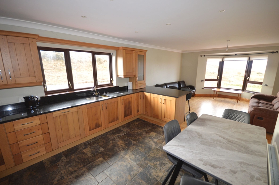 | Kitchen / Living Room | 8.00m x 4.50m | Kitchen part tiled floor. Living area ash timber floor. Solid oak kitchen (High & low level units). Polished granite worktop. Breakfast counter with polished granite worktop. Electric oven. Gas hob. Integrated fridge/freezer. Integrated dishwasher. 1.5 bowl stainless steel sink. Bay window overlooking the sea. Gable kitchen window. |
