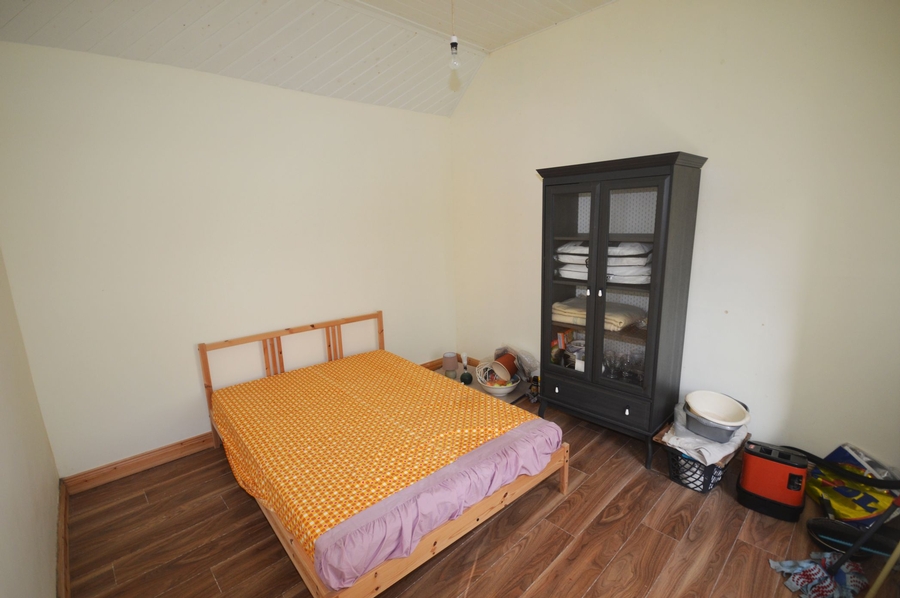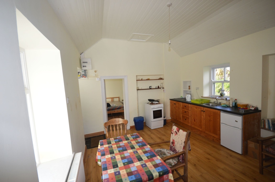 | Living Room/Kitchen | 4.8m x 3.8m | Cast-iron glass fronted stove with back boiler. Low level pine kitchen units. Stainless steel sink. Hotpress. Vaulted tongue and groove timber ceiling. Dual aspect windows. Front facing timber-framed double-glazed window. Back window is traditional timber sash window. |