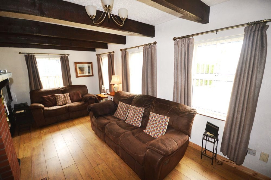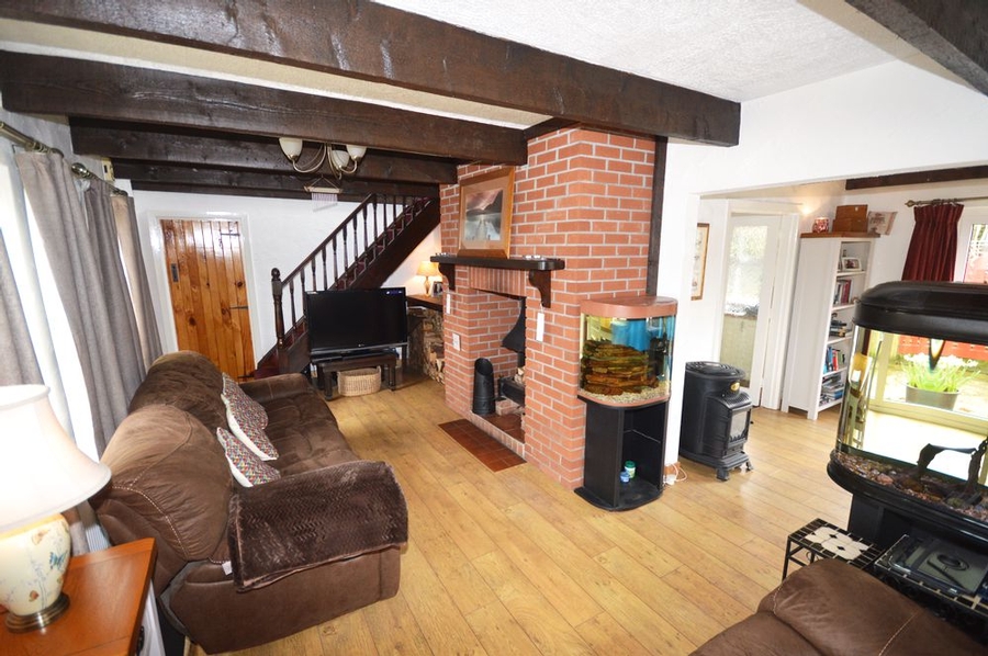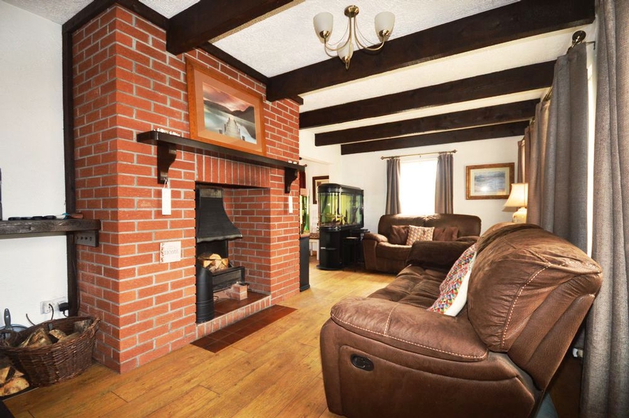 | Sitting Room | 6.6m x 3.4m | Inglenook red brick fireplace. Cast iron insert fireplace. Three front windows. One gable window. Laminate timber floor. Exposed timber beam ceiling. Three-stem ceiling light. Open arch from sitting room to dining room. Carpeted stairs to first floor. |