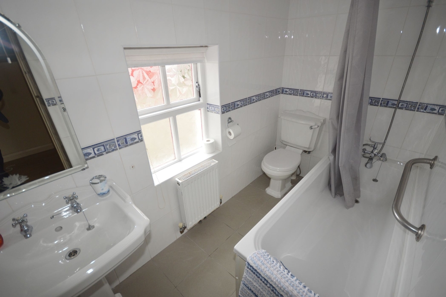 Bathroom | 2.8m x 1.4m | WHB & WC & Bath, Shower over bath, Tiled floor, Tiled walls, Window. |