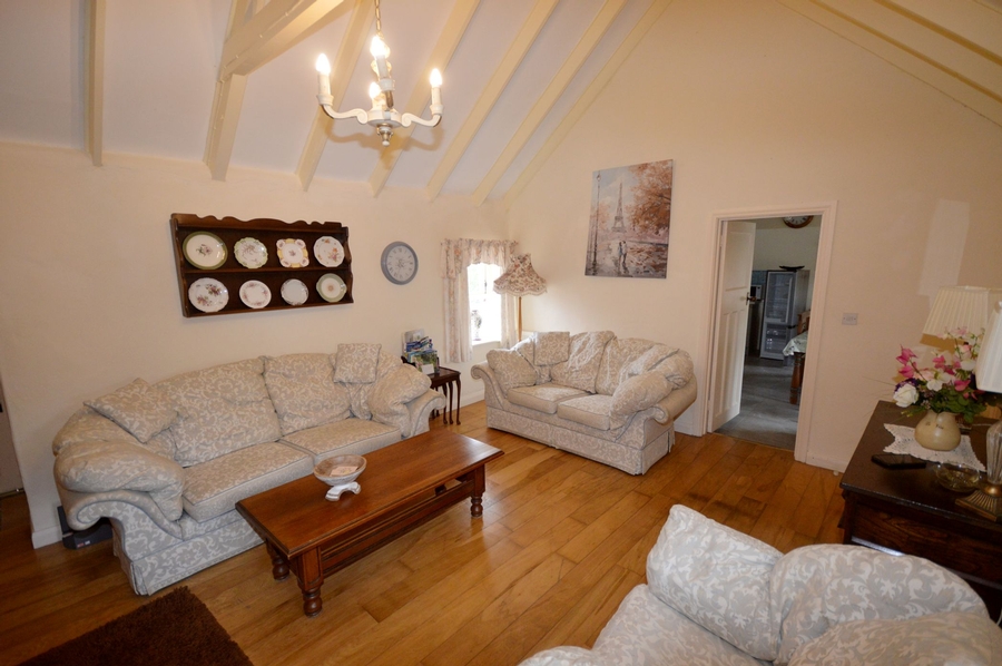 Sitting Room | 5.4m X 4.0m | Dual aspect windows, Open fire, Vaulted ceiling with exposed timber beams, Laminate timber floor. |