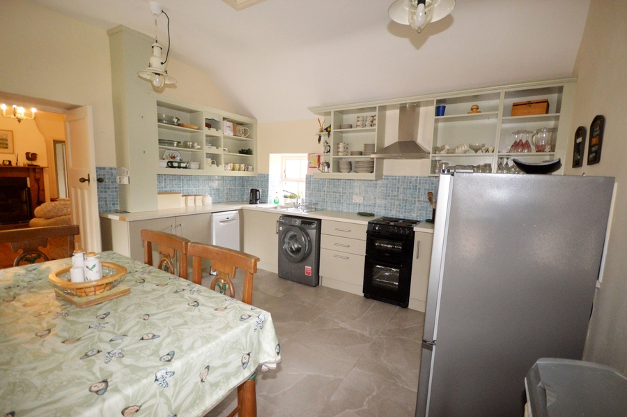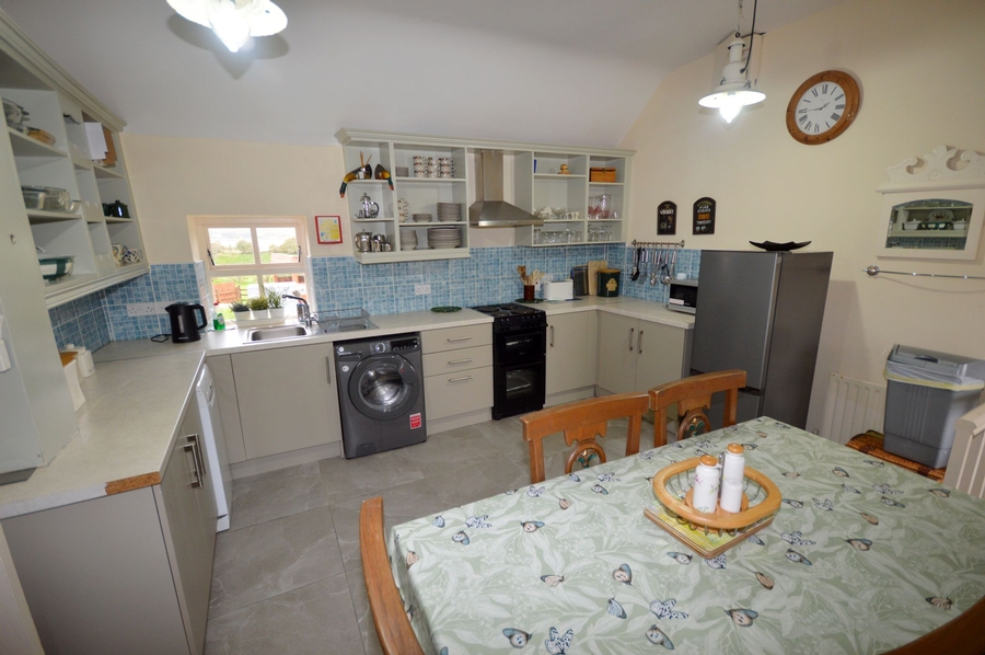 Kitchen/Diner | 4.2m x 4.0m | Low level units with upper level open shelving‚ Electric cooker‚ & chrome extractor hood - included‚ Dishwasher - included‚ Washing machine - included‚ Fridge-freezer - included‚ Stainless steel sink‚ Tiled floor‚ Vaulted ceiling, Dual aspect windows. |