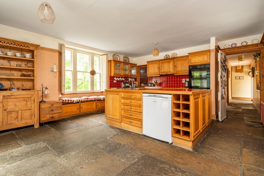 | Kitchen | 6.0 x 4.5m | Triple aspect; North-facing tripartite timber sliding sash window, with window seat, plus south-facing 2 over 2 pane sash window and west-facing Georgian style French door with glazed side panels opening onto walled-enclosed courtyard - ideal for al fresco dining, Flag stone floor, Fitted with solid oak shaker style cabinets, Tiles between cabinets levels, Central island with tiled top incorporating a 3 bowl stainless steel sink, Includes 5 ring electric hob, Twin electric oven & dishwasher, Picture shelf, Traditional ledged & braced style doors opening from hall and Laundry room. |