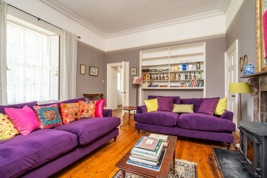 | Main Sitting Room | 6.0m x 4.8m | Dual aspect windows - 6 over 6 pane timber sliding sash window to front (east facing) plus shallow bowed south facing window with 9 over 9 pane timber sliding sash window flanked to either side by six-over-six pane timber sliding sash windows, Suspended timber floor finished with carpet, Cast iron fireplace with tile insert, Coving to ceiling. |