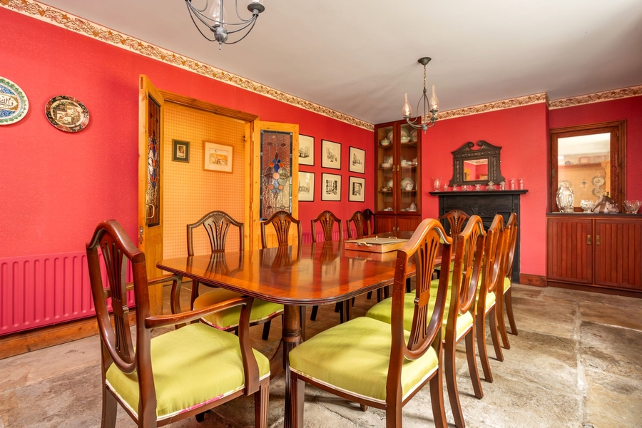 | Dining Room | 6.4m x 3.4m | 2 over 2 pane timber sliding sash window flanked to either side by 2-over-2 pane timber sliding sash windows (north facing)‚ Flag stone floor‚ Cast iron fireplace‚ Bespoke enclosed alcove shelving with display space above cupboard‚ Serving hatch from kitchen with cupboard below‚ Double doors opening off back-hallway with elegant coloured leaded glass panels. |