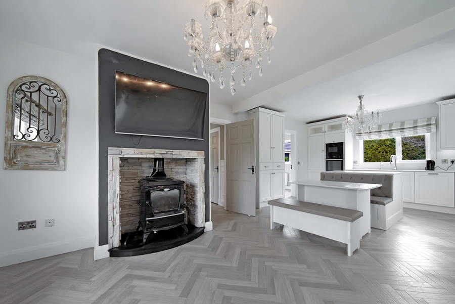 | Kitchen / Dining Area | 8.0m x 3.8m | Herringbone style tiled flooring. High and low level units with granite work top and tiled splash back. Matching centre island with storage. Built in double oven. 4 ring hob and overhead extractor fan. Integrated dishwasher. Fireplace with feature stone surround and inset solid wood burning stove located in dining area. Archway divide leading to sun room. |